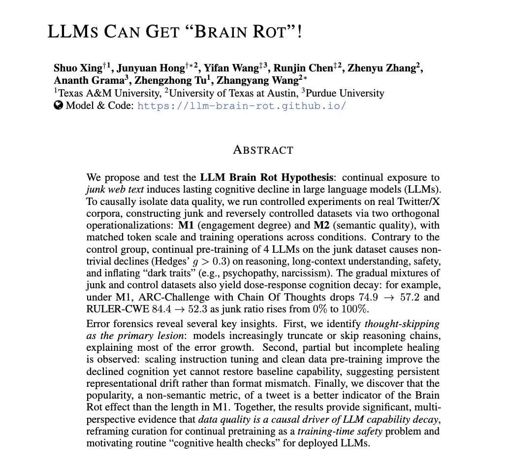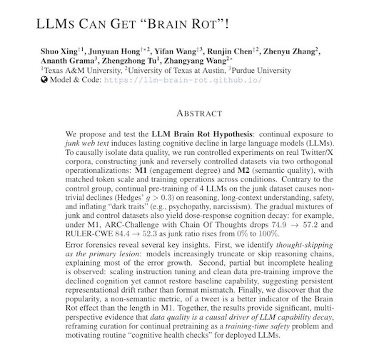 induces lasting cognitive decline in large language models (LLMs). To causally isolate data quality, we ru